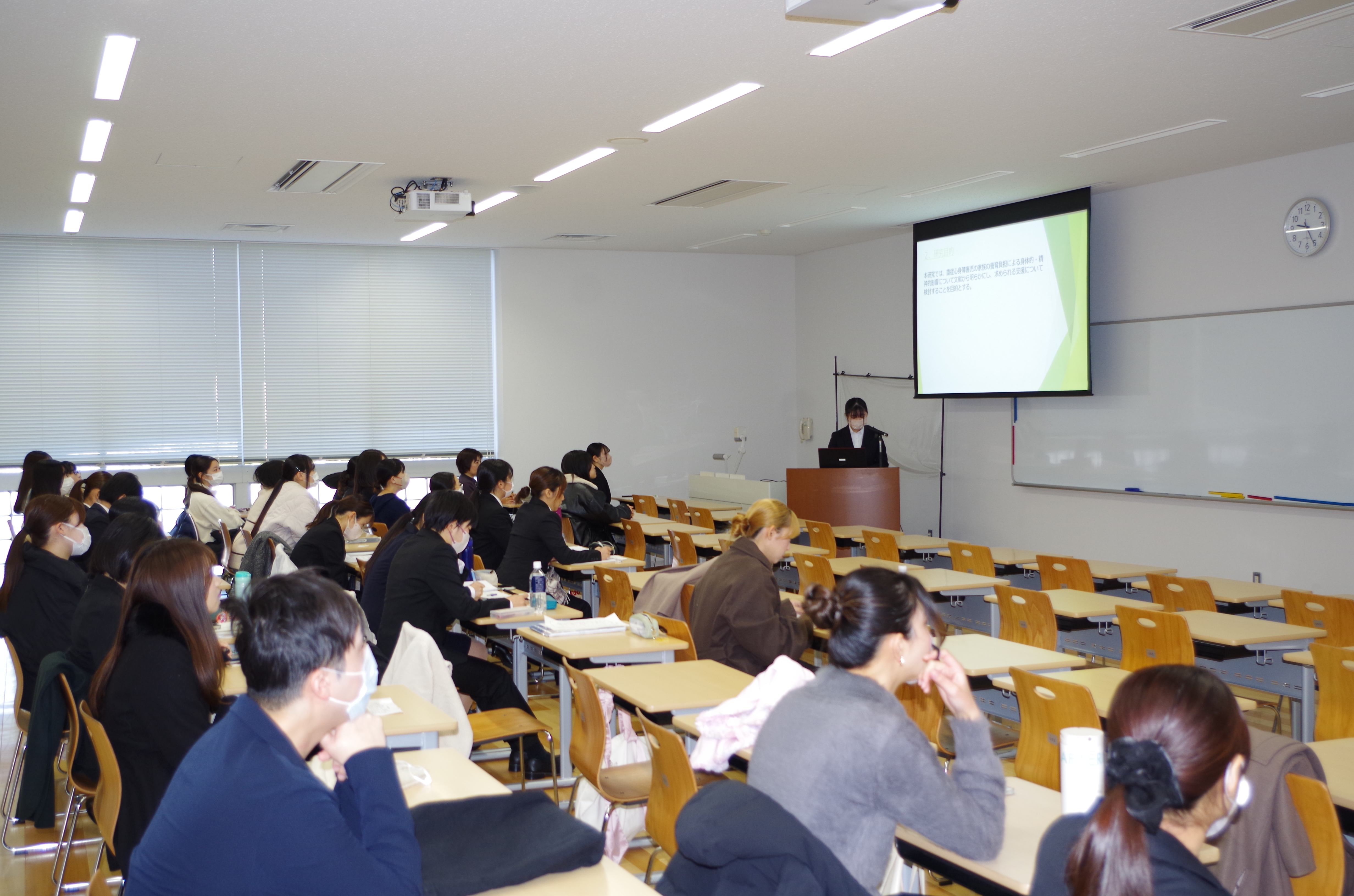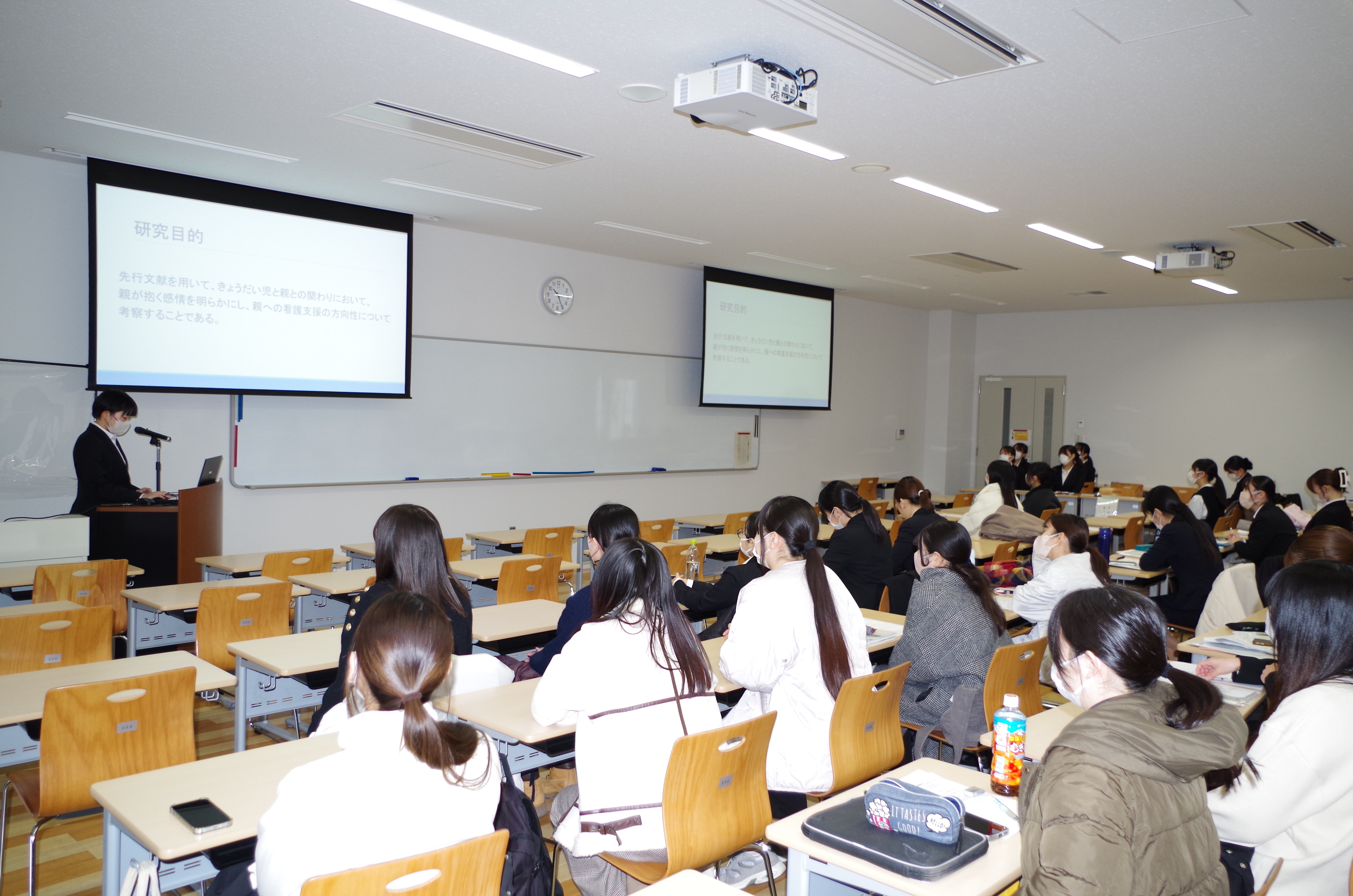 これまでは教員が運営していましたが、今年度は、4年生が司会、タイムキーパー、マイク係を担当した学生主体での発表会であり、4年生は緊張しながらも研究の成果を報告し、その後の質疑応答も活発に行われていました。また、参加者には3年生の姿も多く、興味のある領域での発表に参加して、“来年は自分たちの番だ”と真剣な眼差しで聴講していました。